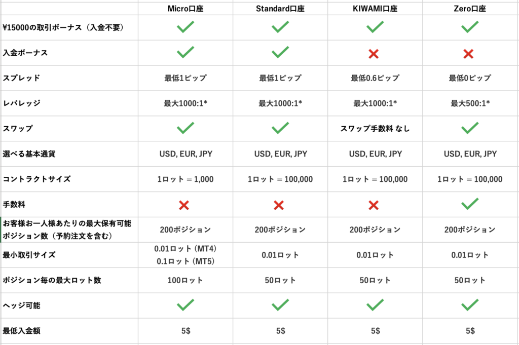 XMTradingの4つの口座は、ボーナス・スプレッド・レバレッジなどの条件がそれぞれ異なります。主な違いは次の一覧をご覧ください。
